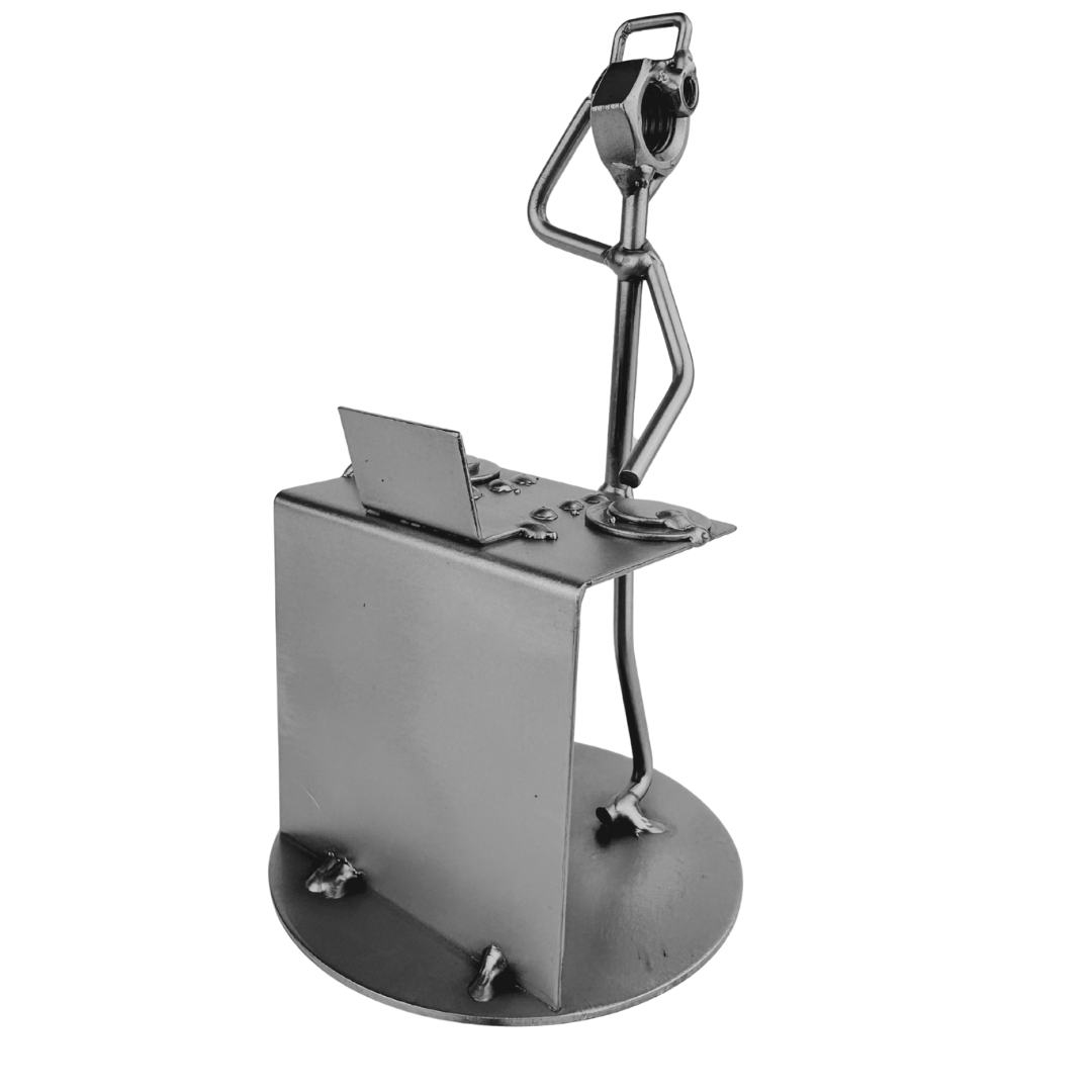 Ręcznie wykonana z metalu figurka przedstawia DJ-a przy konsoli muzycznej,