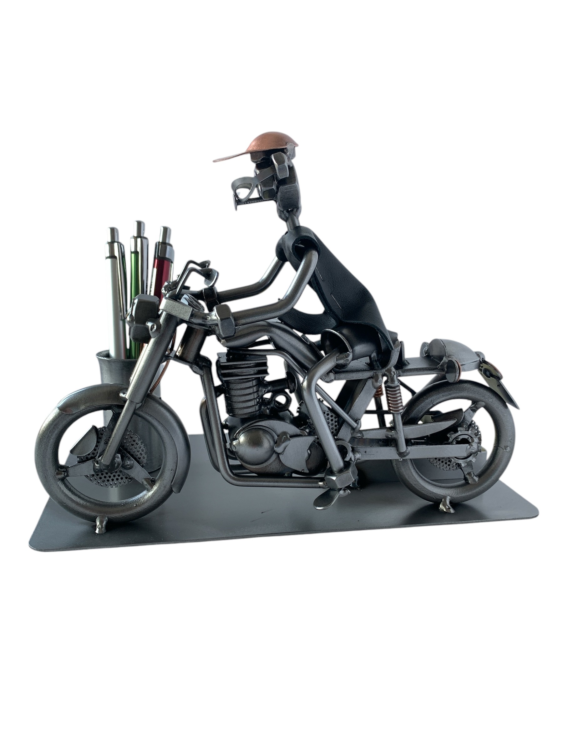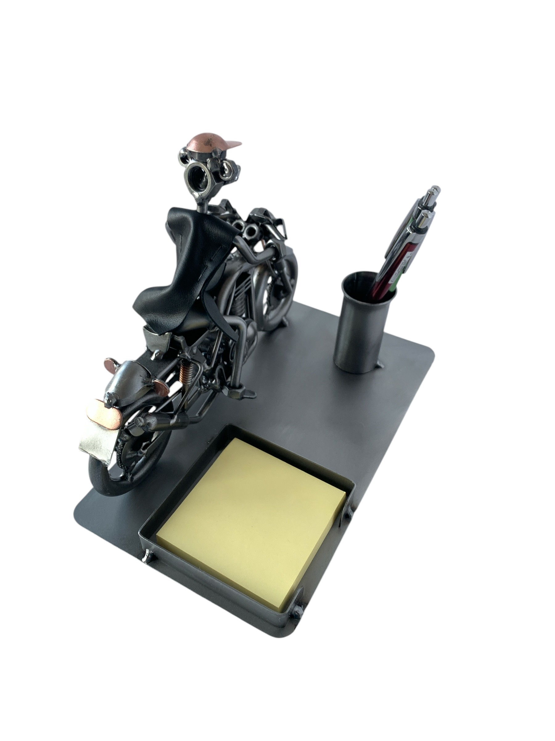 Szukasz wyjątkowego prezentu dla motocyklisty? Nasz ręcznie wykonany metalowy przybornik to stylowy i praktyczny dodatek na biurko. Solidna konstrukcja, unikalny design i dbałość o detale sprawiają, że to doskonały wybór dla fanów motocykli.